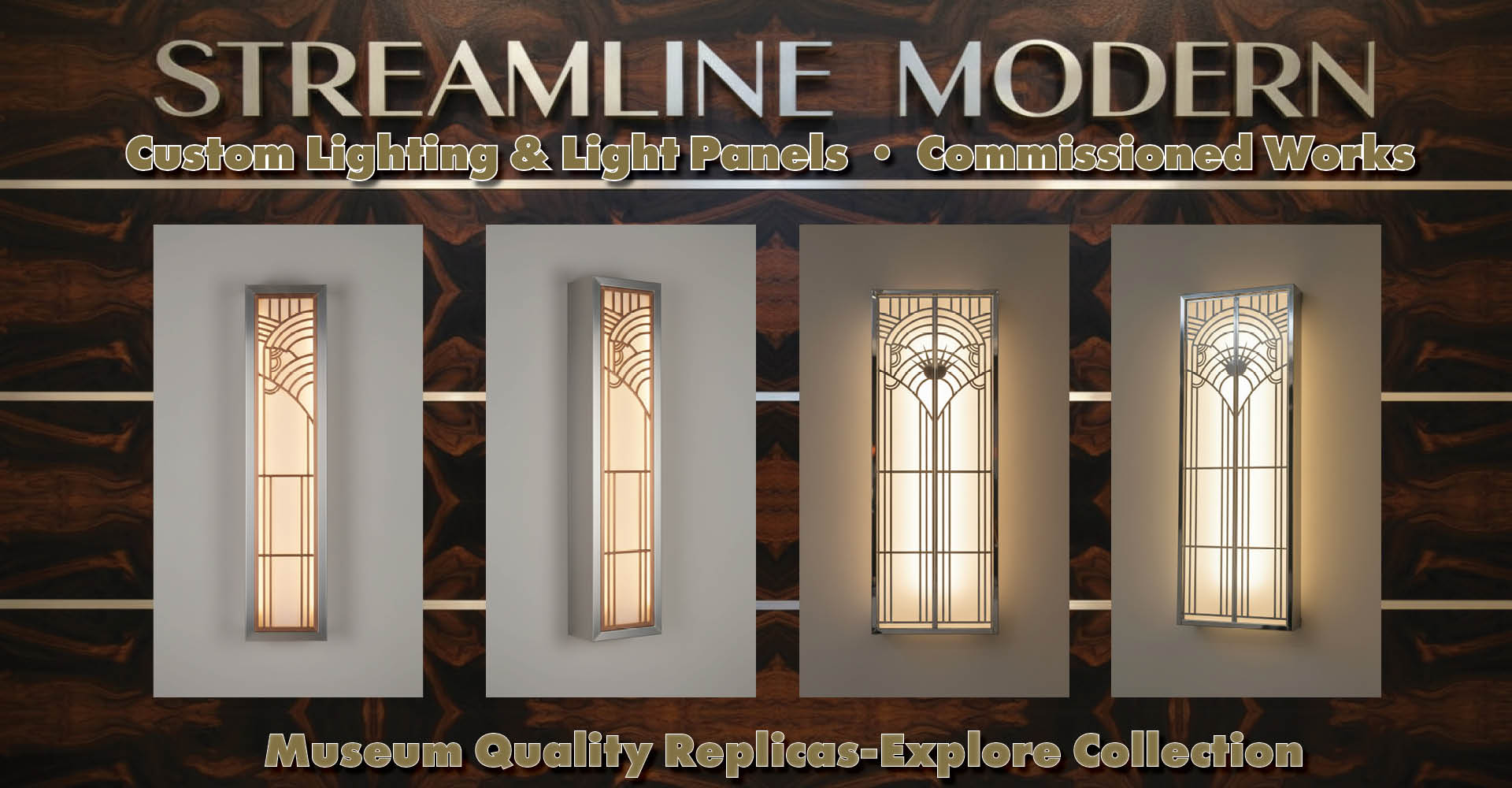 Streamline Modern creates Art Deco lighting defined by the geometric elegance and refined materials of the 1920s and 1930s. Our collection includes designer lamps, wall sconces, chandeliers, and custom fixtures, all reflecting the streamlined sophistication of the era. Each piece combines period-inspired detailing with contemporary manufacturing standards.