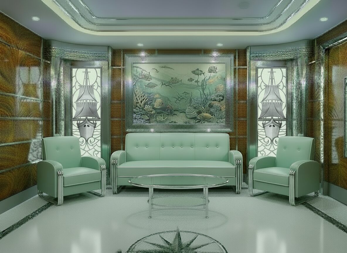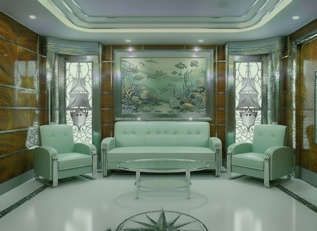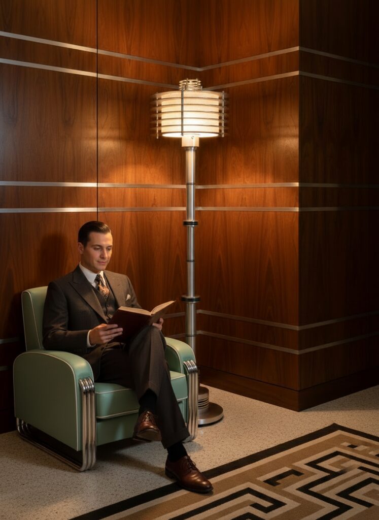 We produce lighting inspired by Art Deco masters such as René Herbst, Donald Deskey, and Walter von Nessen. Fixtures range from intimate table lamps to large-scale chandeliers, incorporating stepped forms, rhythmic geometry, and polished surfaces characteristic of the period. Illuminated panels and architectural lighting draw from landmark interiors—including theaters and ocean liners—adapted for modern spaces.